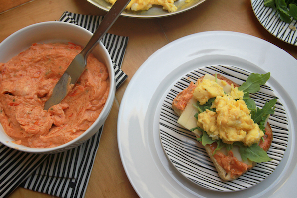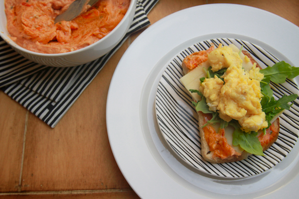 I smeared it on sourdough toast, placed cheddar on top with arugula & scrambled eggs.