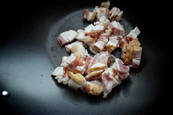 First we render the bacon in the wok. Cook for about 10 minutes, drain the fat.