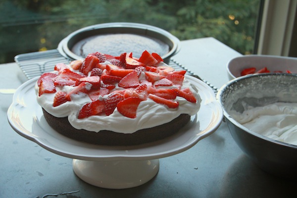 It’s a cake that doesn’t smack you over the head with chocolate; it’s all about the whipped cream and strawberries! This cake is so good, fluffy, and airy that it makes you abandon your intentions of eating “healthy.” It might become a staple this Summer when we’re entertaining.