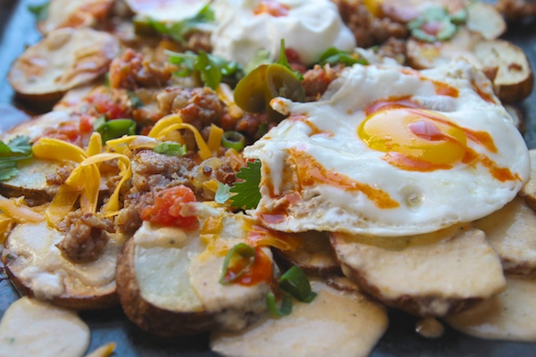 I know we’re supposed to be in Thanksgiving Brainstorm Mode right now but let’s talk about the days after when you have company over at your house and you want to feed them something delicious for breakfast. Besides dipping into your leftover stash, you should make them this showstopper Roasted Potato Breakfast Nacho recipe from Joy the Baker’s Homemade Decadence Cookbook. If you haven’t bought yourself that book WHAT ARE YOU WAITING FOR??! Seriously. I can imagine it would also be good for one of those Sunday football situations as well. My maj knows what’s up when it comes to potatoes and cheese. I’ll bring the runny egg yolk to the situation because that’s how I roll. Teamwork!
