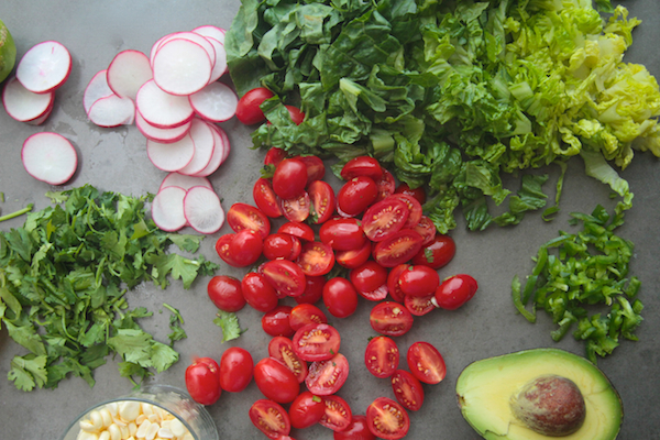 Cut up the tomatoes, slice the radishes, chop up the green onions, cilantro & lettuce.