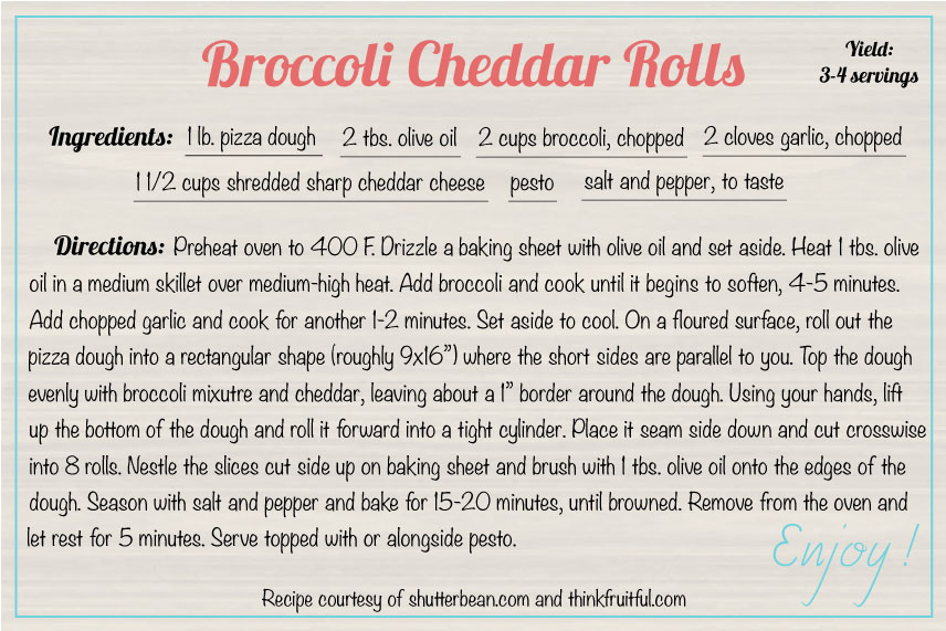 Broccoli, cheddar, red pepper flakes, and garlic are all rolled up together in pizza dough. We bake in the oven and we try our hardest not to eat the whole batch.