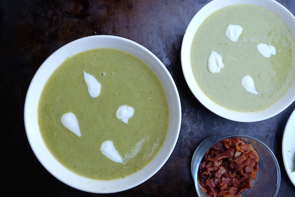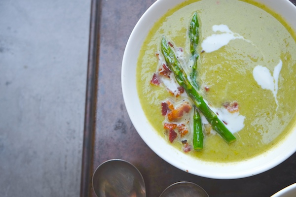 Smoky bacon is the real star in this soup. We crisp some up set it aside for your topping pleasure. Then we cook the onions, garlic and asparagus in the bacon fat and make a soup from it. Creme fraiche is added at the very end for the creamy component. Because creme fraiche is a little tart, it adds the perfect balance. Asparagus Asparagus (soup) whenever you are able. Oh man…I gotta show Cooper an episode of ALF now.