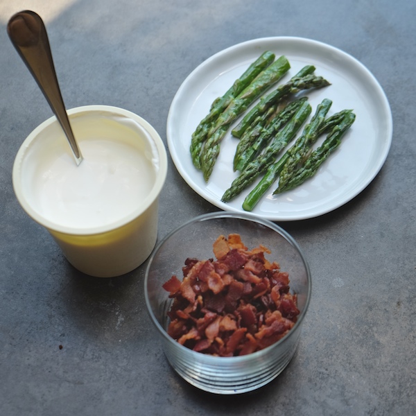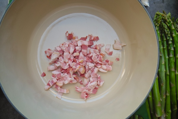 Reserve a few of the asparagus spears. I kept a few longer for this purpose. They’re like dangling earrings to an outfit. They add a little texture and a little something something to the soup. Bacon and creme fraiche for later.