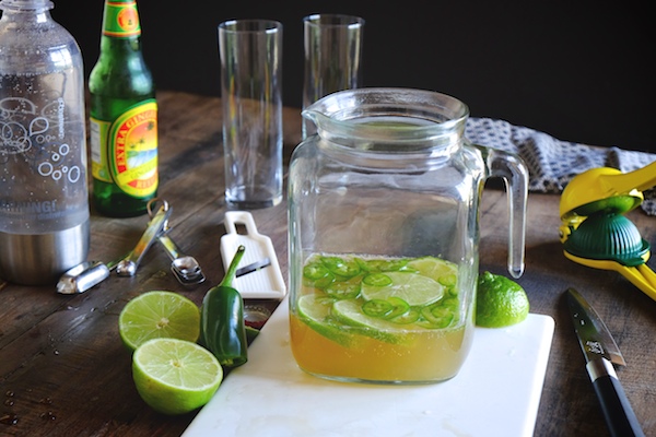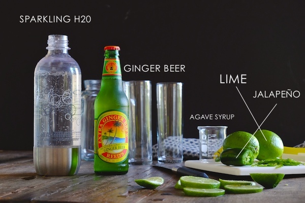 Jalapeños are sliced thin and mixed with lime juice sweetened with agave. Ginger beer adds a nice warm spice, sparkling water evens everything out for a refreshing/spicy drink.