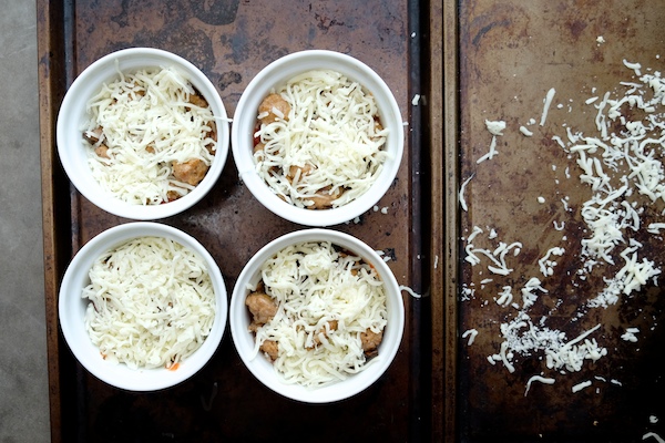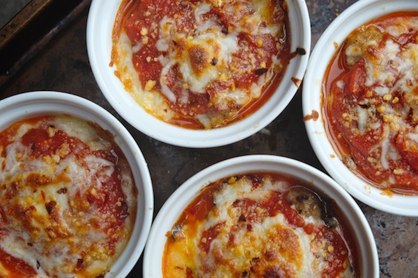 This recipe is super adaptable. If you’re not a fan of sausage & mushroom (that’s my preferred topping combination) then you can substitute whatever toppings your heart desires. Also! Throw some fresh spinach in the mixture too. Just sauté it at the very end with the sausage. The idea is that we take 8 oz. ramekins and create something like a little lasagna (sans the noodles) with them. I break this recipe up into four ramekins so you can freeze some or spread out your servings throughout the week.