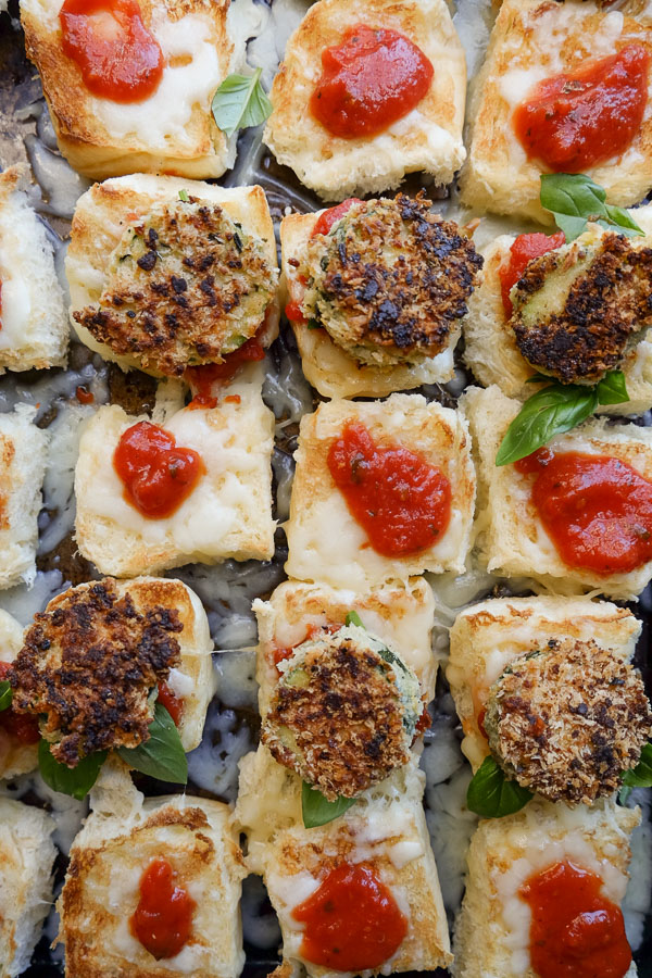 Panko crusted fried zucchini sandwiched in between soft rolls with marinara and melted parmesan. Basil is stuffed in for a little herbal kick. Bet you can’t eat just three.