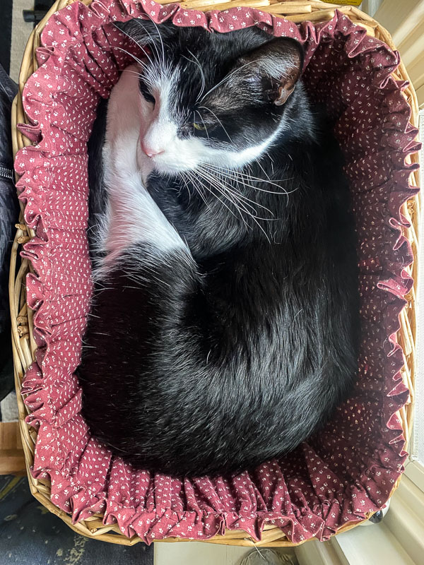 Huggy curled up in a basket my Mom made. I wish she could have met him. She would love him.
