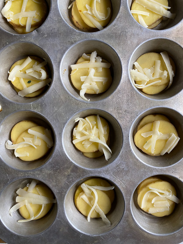Layer the two potato slices into each of the prepared muffin cups, add a few shreds of cheese and layer the tops with the remaining potatoes, filling each cup. Sprinkle the remaining cheese on the top of each stack, and season with salt, pepper, and reserved thyme. Bake until the edges and tops are golden brown and the centers are tender, 45 to 55 minutes. Let the potato stacks rest for 3 to 5 minutes, then carefully remove them with a small offset spatula. Serve immediately.