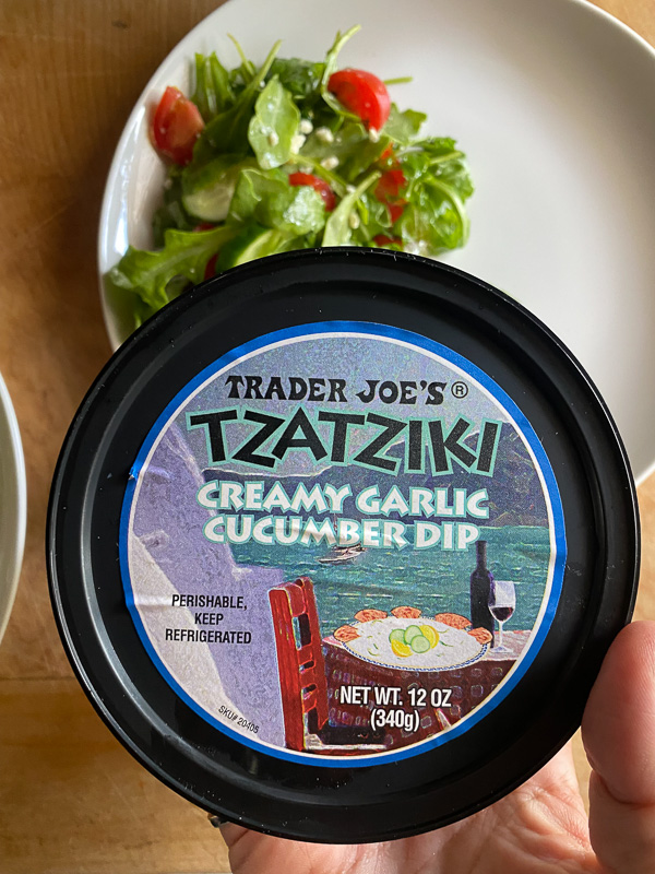 Pick yourself up some of this tzatziki while you’re at Trader Joe’s if you don’t feel like making your own yogurt dip. Their garlic spread/ dip would be great with it too. Now I am wishing I put shrimp in a pita WITH my salad and this dip! Next time…