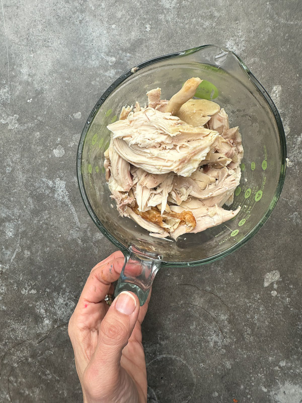 Also if you didn’t pull off the chicken meat from the rotisserie chicken when you brought it home (it’s easier when it’s hot!), you can always drop the chicken in the soup and heat it up to make it easier.